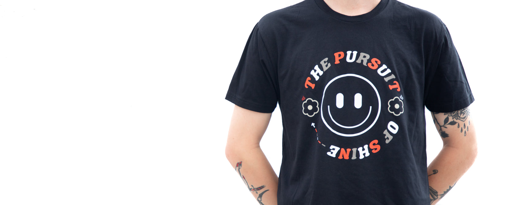 The Pursuit Of Shine T-Shirt is designed in a polyester/cotton blend and features our Pursuit Of Shine design in a White, Red, and Grey color way!